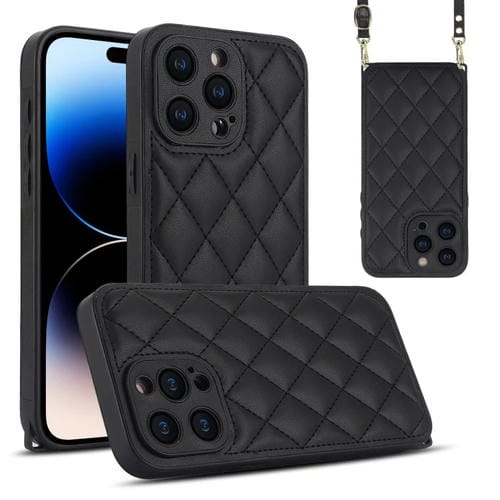 Estuche para Teléfono iPhone 14 Pro Max Textura Rómbica con Cordón Doble (Negro)