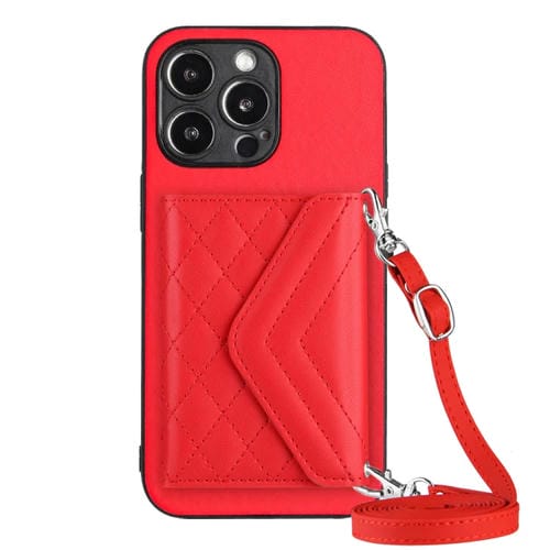 Estuche para Teléfono iPhone 14 Pro Max Rfid Bolsa para Tarjetas Textura Rómbica Cordón Largo (Rojo)