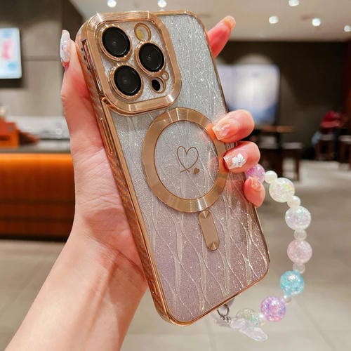Funda para Teléfono iPhone 14 Pro Max Loves Leaves con Pulseras Brillo Degradado Magsafe TPU Fibra de Carbono (Oro)