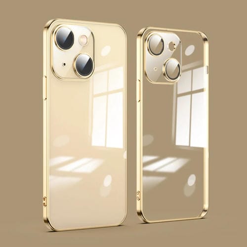 Protector de Lente + Caja de Teléfono Galvanizada + Para iPhone 14 + Vidrio a Prueba de Polvo + (Oro)