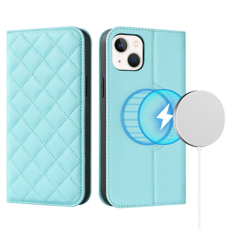 Funda para iPhone 14 Rhombic Magsafe Rfid Antirrobo de Cuero (Azul Cielo)
