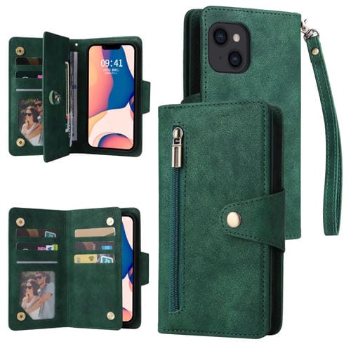 Funda de Cuero para Teléfono iPhone 14 Rivet Buckle Tres Pliegues 9 Cards (Verde)