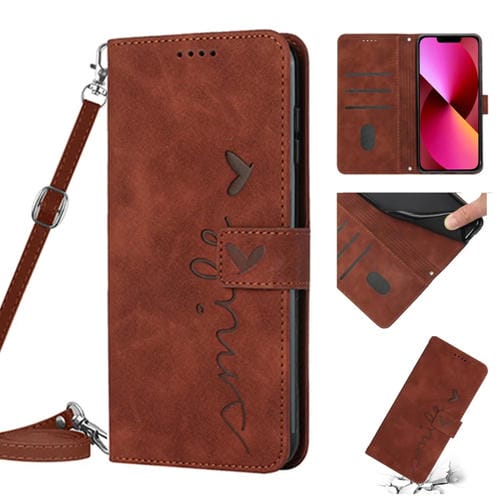 Funda para iPhone 14 Skin Feel Heart Pattern de Cuero con Cordón (Marrón)
