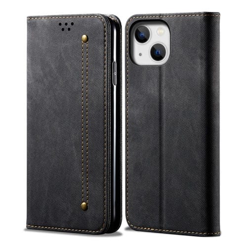 For iPhone 15 Denim Texture Casual Style Horizontal Flip Leather Case (Black)