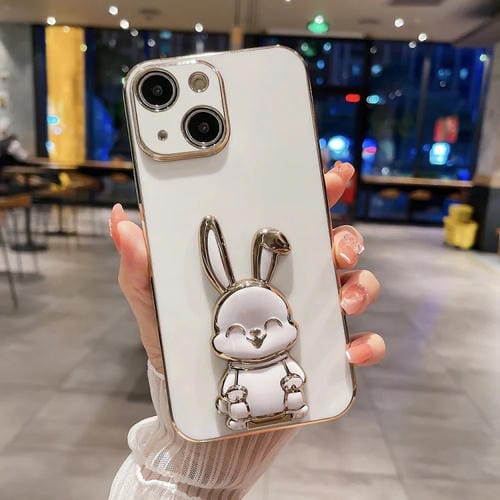 Estuche para Teléfono iPhone 15 con Soporte de Conejo Chapado (Blanco)