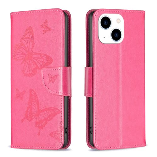 Estuche para Teléfono iPhone 15 Cuero con Patrón de Dos Mariposas en Relieve (Rosa Roja)