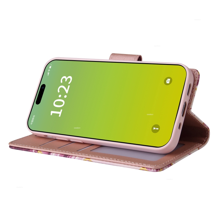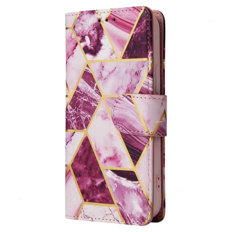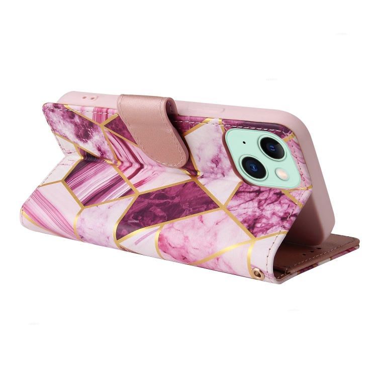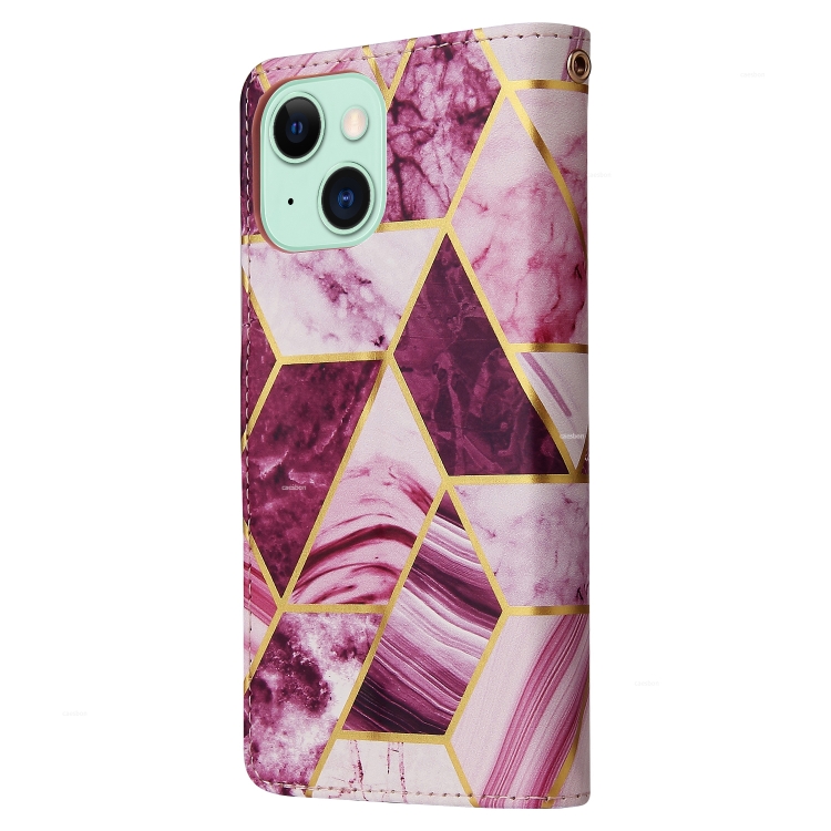 Funda de Cuero para iPhone 15 con Costuras Bronceadoras de Mármol (Púrpura)