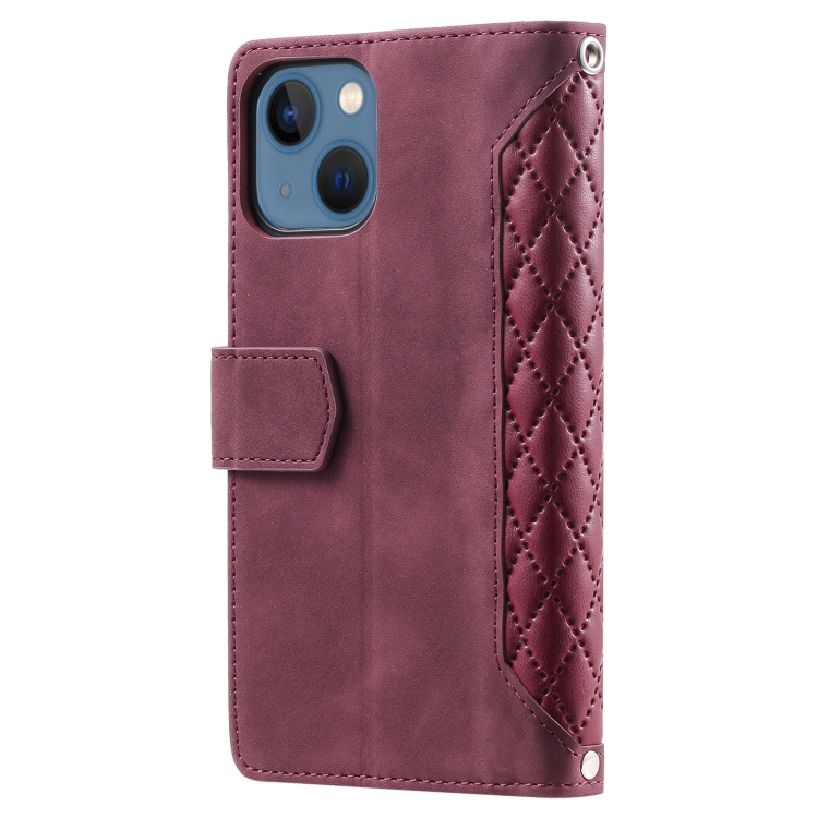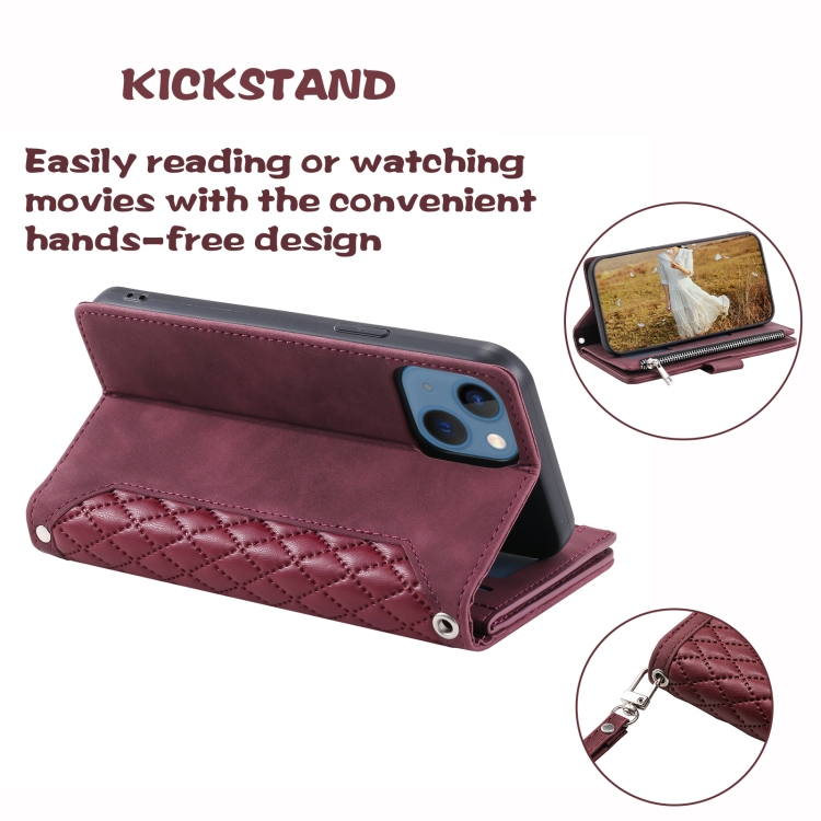 Funda para iPhone 15 Cuero con Cremallera Textura de Rejilla y Cordón (Rojo Vino)
