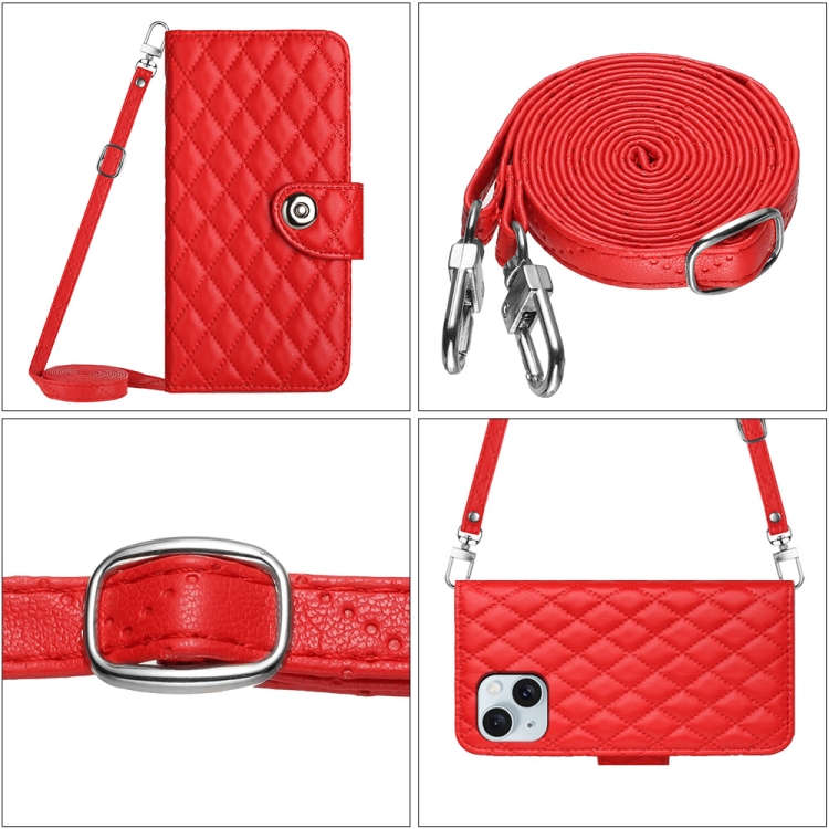 Funda de Cuero para iPhone 15 con Tapa Textura Rómbica y Cordón Largo (Rojo)