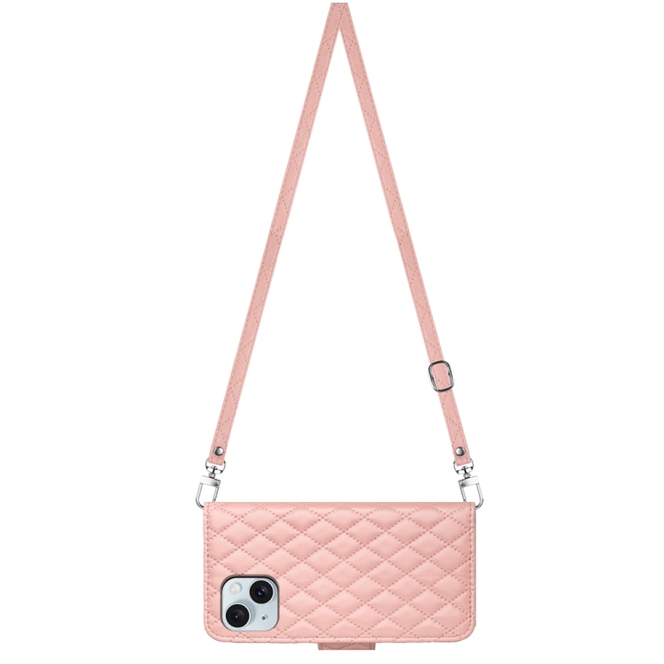 Funda para iPhone 15 de Cuero con Tapa Textura Rómbica y Cordón Largo (Rosa Coral)