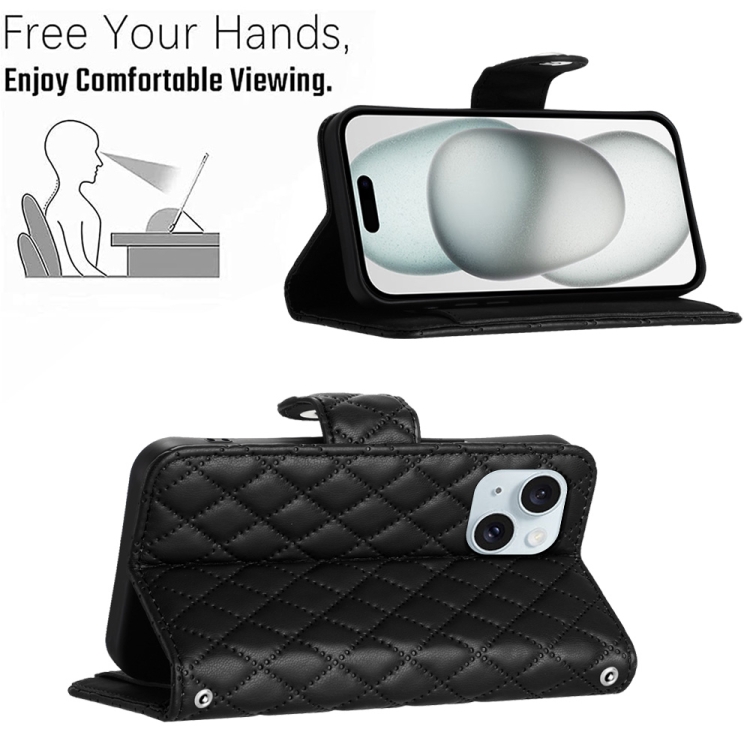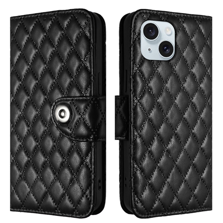 Funda de Cuero para iPhone 15 con Tapa Textura Rómbica y Cordón (Negro)