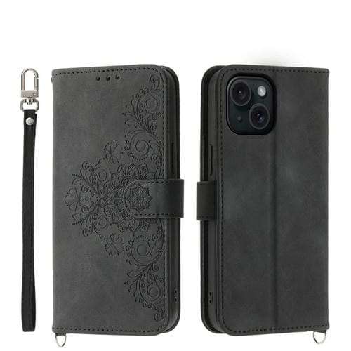 Funda de Cuero para iPhone 15 con Billetera en Relieve y Flores con Sensación de Piel (Negro)