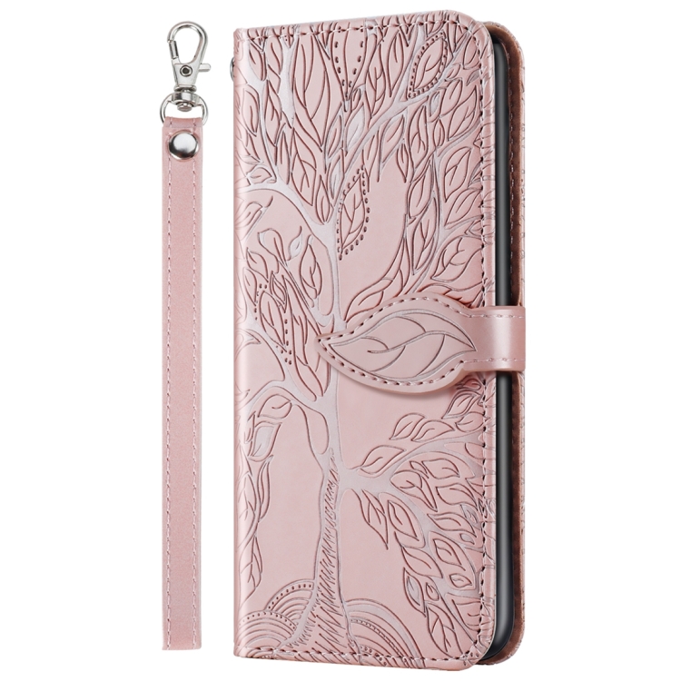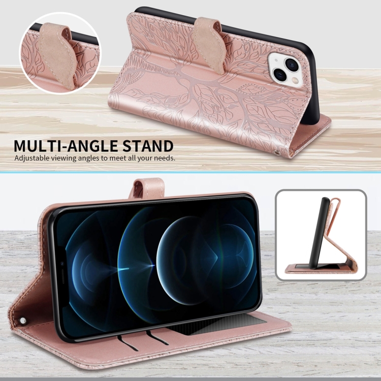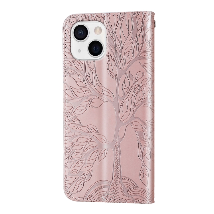Funda de Teléfono iPhone 15 Cuero Estampado Árbol de Vida (Oro Rosa)