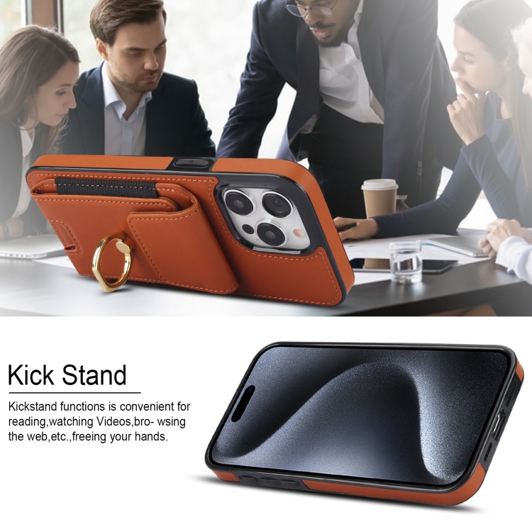 Funda elástica para teléfono iPhone 15 con soporte para anillo y bolsa para tarjetas (Marrón)