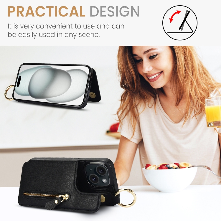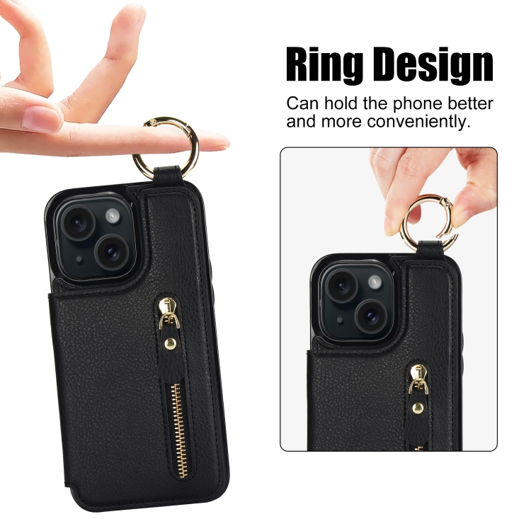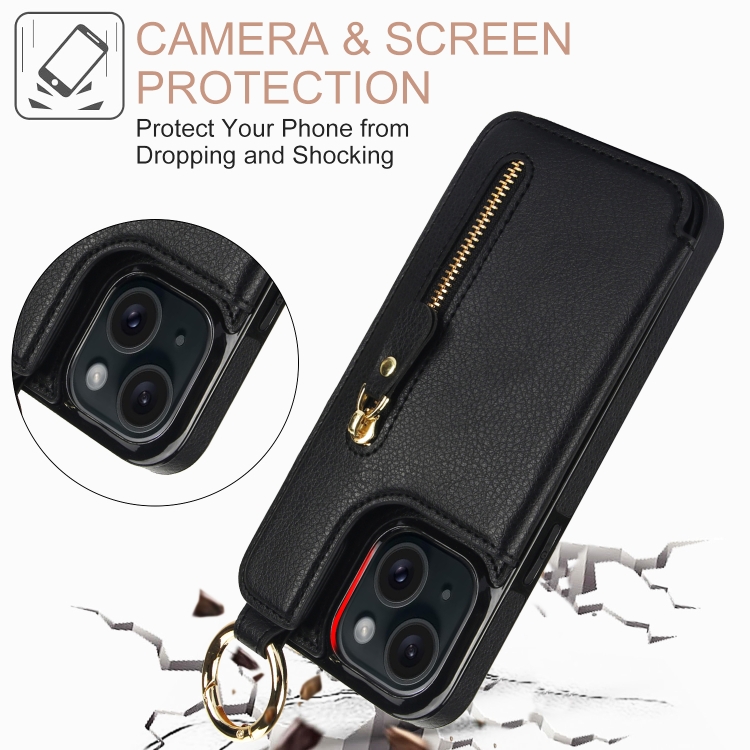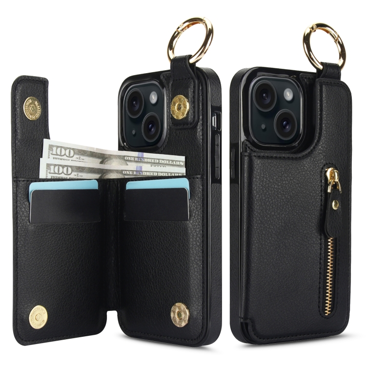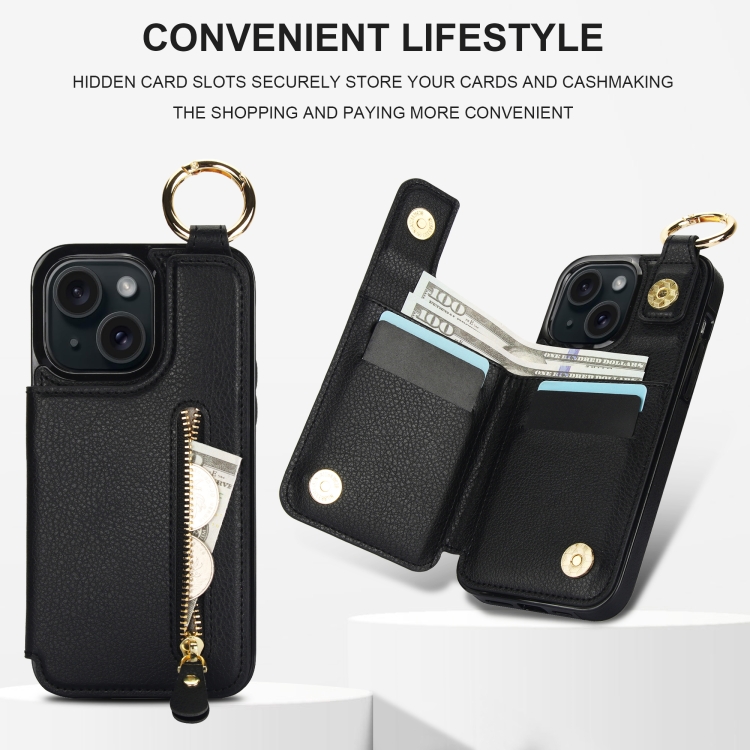Funda para Teléfono iPhone 15 con Bolsa para Tarjetas Doble Hebilla y Cremallera (Negro)