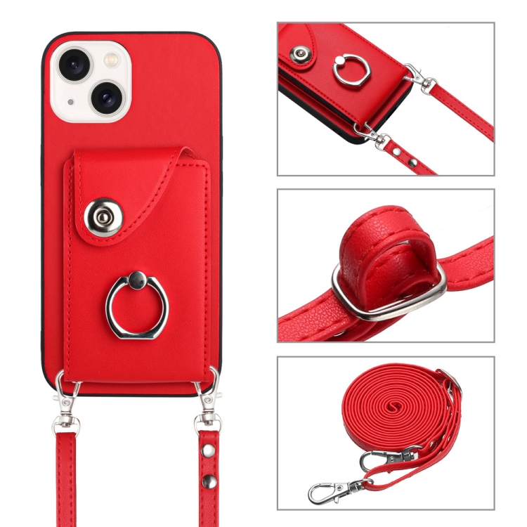 Funda para Teléfono iPhone 15 con Soporte para Anillo y Bolsa para Tarjeta de Órgano con Cordón Largo (Rojo)