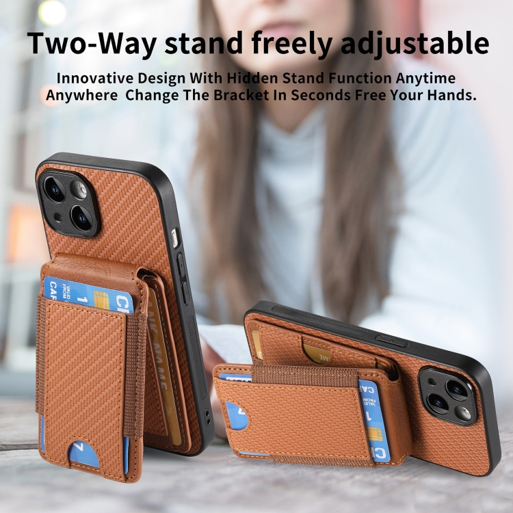 Funda para Teléfono iPhone 15 con Soporte y Billetera con Tapa Vertical de Fibra de Carbono (Marrón)
