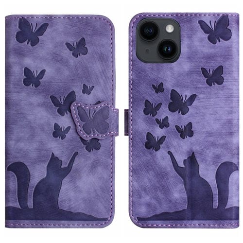 For iPhone 15 Butterfly Cat Pattern Flip Leather Phone Case (Purple)