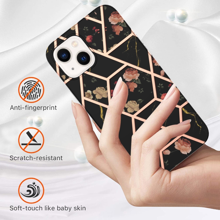 Funda para iPhone 15 TPU Galvanoplastia Empalme Mármol Patrón de Flores a Prueba de Golpes (Flor Negra)