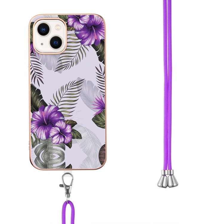 Funda para iPhone 15 TPU Galvanoplastia Patrón Imd a Prueba de Golpes con Cordón (Flor Púrpura)
