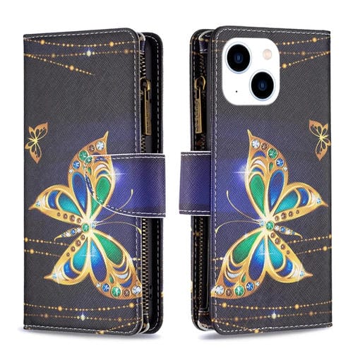 Funda de Cuero para iPhone 15 Patrón de Dibujo Coloreado con Cremallera (Mariposa Grande)