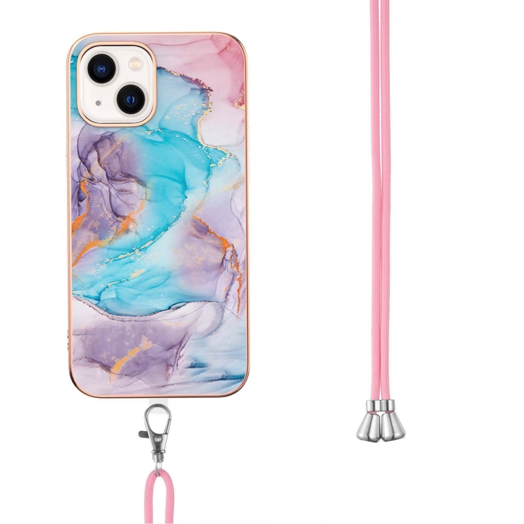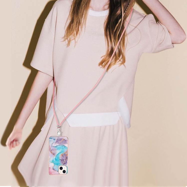 Estuche TPU para iPhone 15 Patrón Galvanoplastia Imd a Prueba de Golpes con Cordón para Cuello (Mármol Azul)