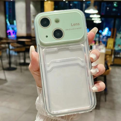 Estuche híbrido para teléfono iPhone 15 Plus TPU con ventana grande PC y ranura para tarjeta (Verde)