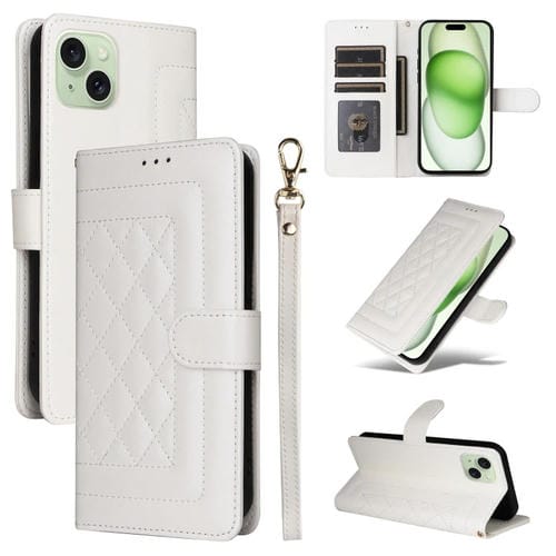 For iPhone 15 Plus Diamond Lattice Leather Flip Phone Case (White)