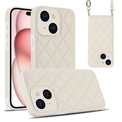 For iPhone 15 Plus Rhombic Texture Phone Case with Double Lanyard (White)