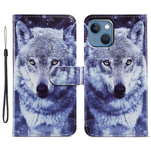Estuche para Teléfono iPhone 15 Plus Cuero con Dibujo Coloreado (Lobo Blanco)