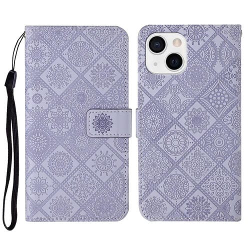 For iPhone 15 Plus Ethnic Style Embossed Pattern Leather Phone Case (Purple)