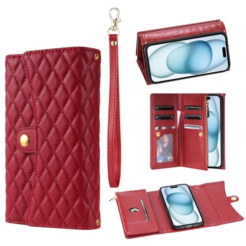Estuche para Teléfono iPhone 15 Plus Cuero Rómbico con Billetera MultiTarjeta y Cremallera (Rojo)