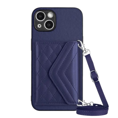 For iPhone 15 Plus RFID Phone Case with Rhombic Texture Card Bag and Long Lanyard (Dark Purple)