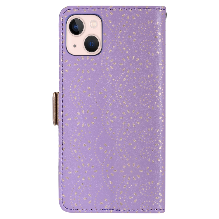 Funda de Cuero para iPhone 15 Plus con Cremallera y Doble Botón Patrón de Encaje y Cordón (Púrpura)