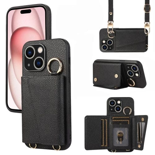 For iPhone 15 Plus Phone Case Leather Back Cover with Crossbody Ring (Black)