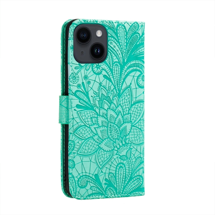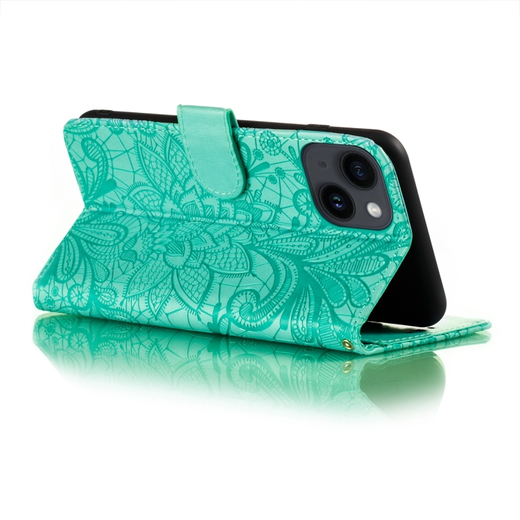 Funda para Teléfono iPhone 15 Plus Cuero con Tapa y Estampado de Flores de Encaje (Verde)