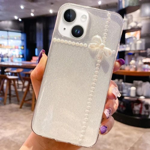 Funda para teléfono iPhone 15 Plus Pearl Bow Glitter Epoxy TPU con Nudos Cruzados