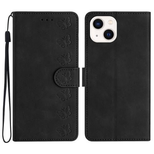 Funda para iPhone 15 Plus Seven Butterflies Caja de Teléfono de Cuero En Relieve (Negro)