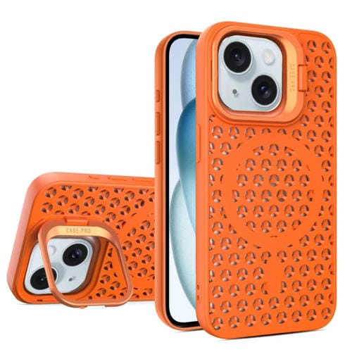 For iPhone 15 Plus Hollow Cooling Lens Holder MagSafe Magnetic TPU Phone Case (Orange)
