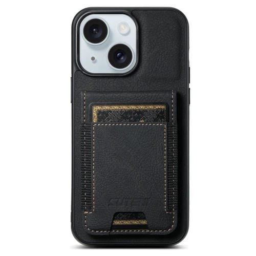 Funda para Teléfono Suteni H03 para iPhone 15 Plus con Soporte para Tarjeta Cuero Litchi (Negro)