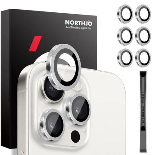 Cubierta Protectora Lente Cámara Northjo iPhone 15 Pro y 15 Pro Max Anillo Metal (Plata) 2 Set 6 Piezas