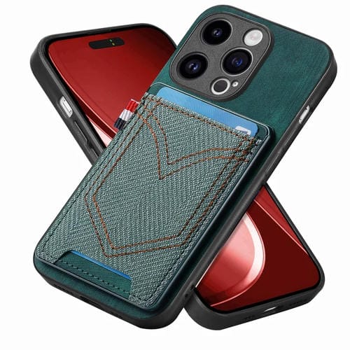 Funda para Teléfono iPhone 15 Pro Denim Texture Leather Skin con Ranura para Tarjeta (Verde)