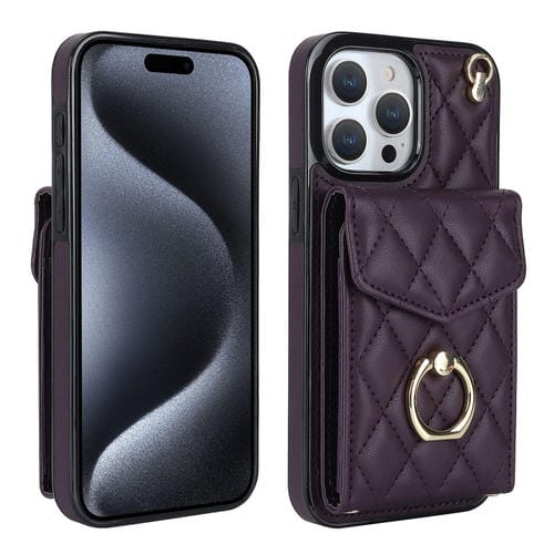 Estuche para Teléfono iPhone 15 Pro con Bolsa para Tarjetas Textura Rómbica y Cordón Largo (Púrpura Oscuro)