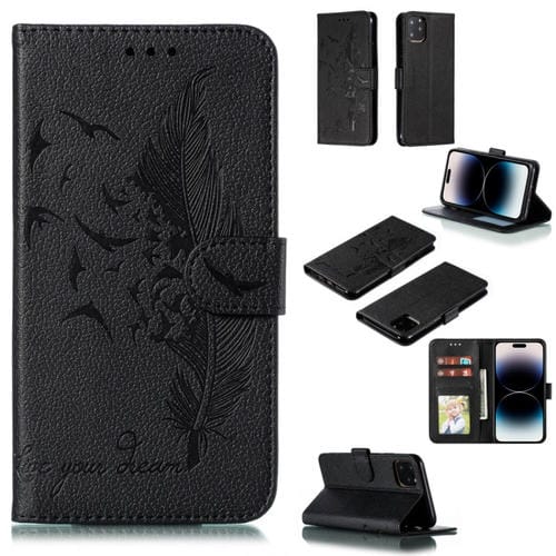 For iPhone 15 Pro Litchi Texture Leather Phone Case with Feather Pattern (Black)
