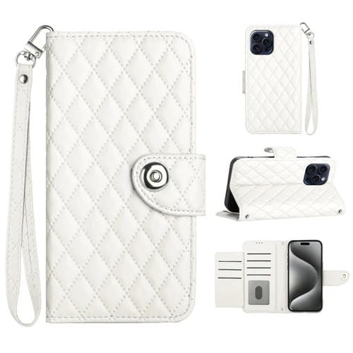 Funda para iPhone 15 Pro Cuero con Tapa Textura Rómbica y Cordón (Blanco)