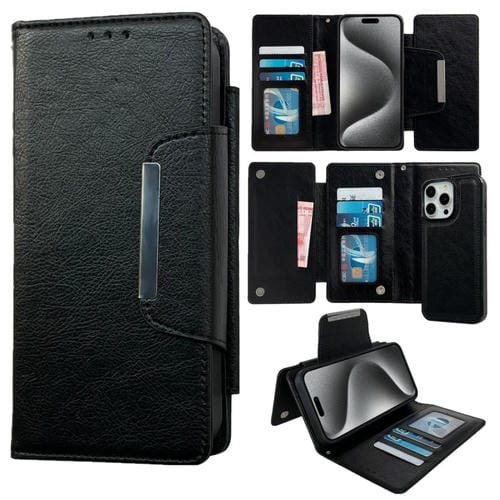 Funda de Cuero para Teléfono iPhone 15 Pro con Billetera Multifuncional para 7 Tarjetas (Negro)