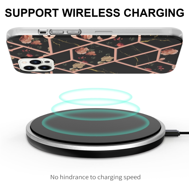 Funda para iPhone 15 Pro TPU Galvanoplastia Empalme Mármol Patrón de Flores a Prueba de Golpes (Flor Negra)