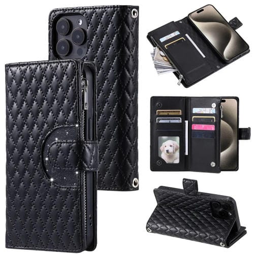 Funda para Teléfono iPhone 15 Pro Glitter Lattice Zipper Wallet Cuero (Negro)