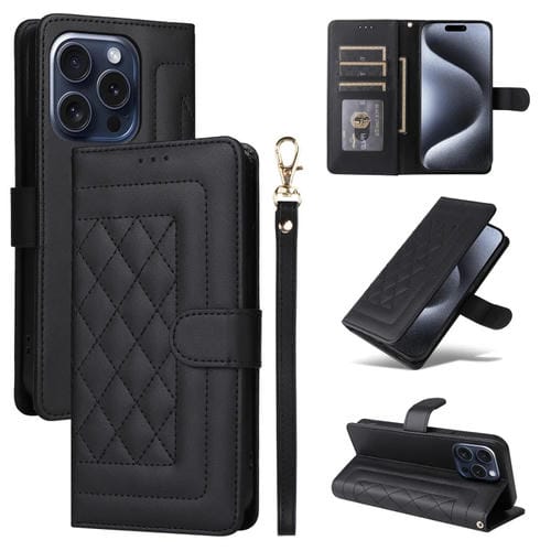 Funda para iPhone 15 Pro Max Diamond Lattice de Cuero con Tapa (Negro)