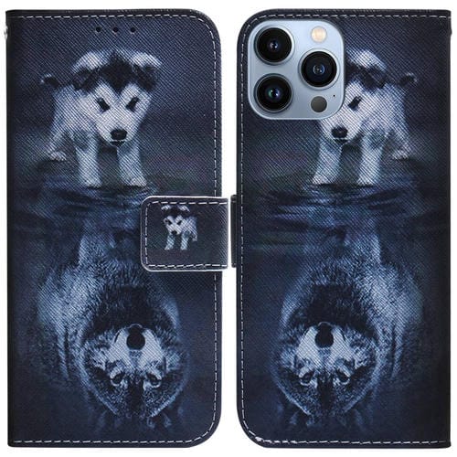 Estuche de Teléfono iPhone 15 Pro Max Cuero con Tapa Dibujo Coloreado (Lobo y Perro)
